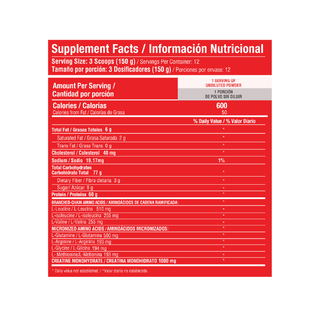 Suplemento en polvo con sabor a vainilla diseñado para apoyar el aumento de masa muscular y proporcionar energía durante el entrenamiento. Rico en proteínas y nutrientes esenciales, ayuda a mejorar la recuperación muscular, potenciar el rendimiento físico y promover un estado general de bienestar y vitalidad.