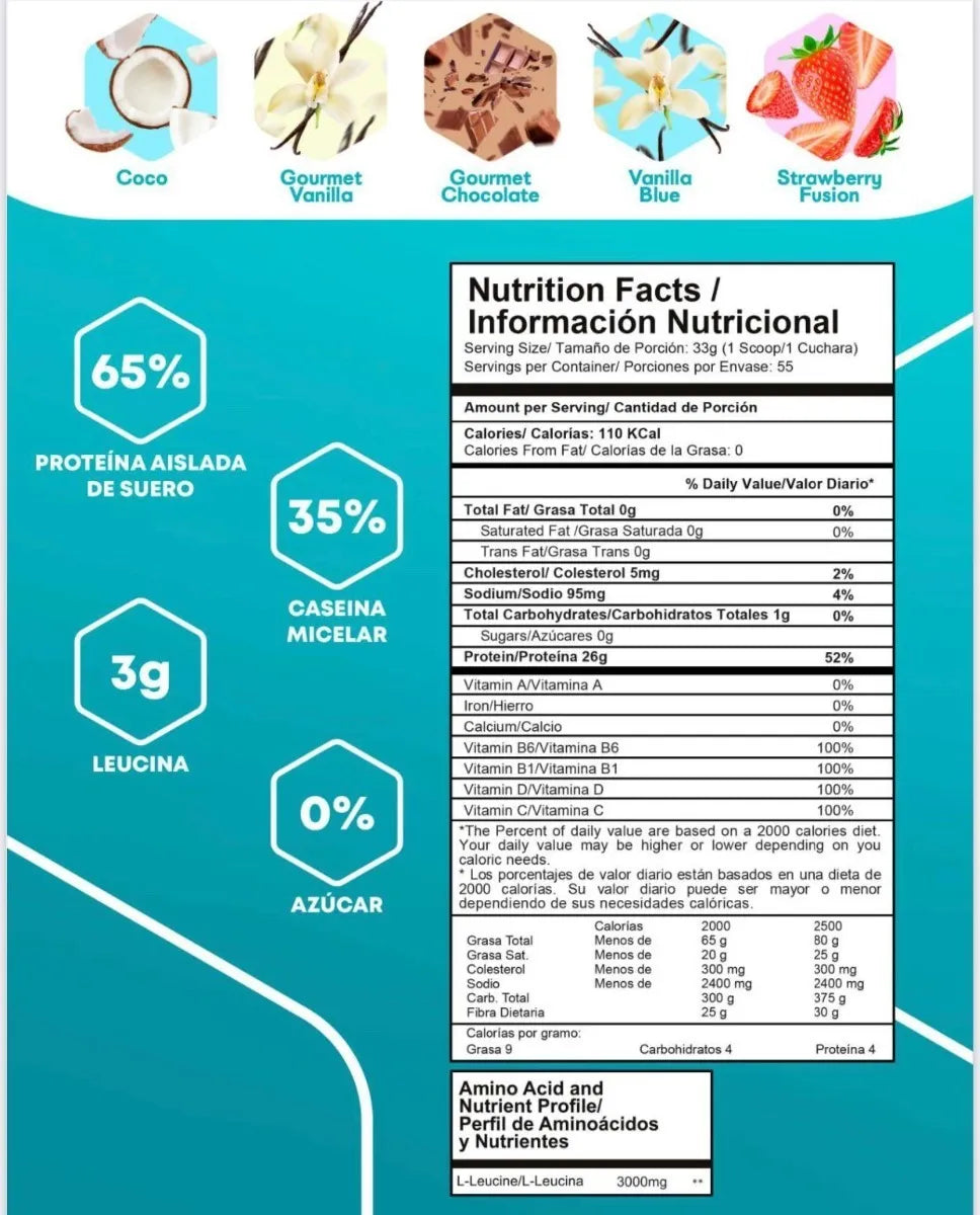 Proteína en polvo de alta calidad que favorece el desarrollo muscular, mejora la recuperación post-entrenamiento y aporta energía para el rendimiento físico, con delicioso sabor a vainilla.