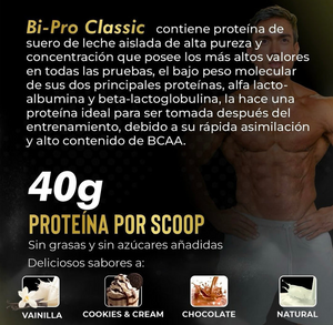Bi-Pro Classic es un suplemento alimenticio a base de proteína aislada de suero de leche bovina, ideal para quienes buscan una fuente de proteína de alta calidad, rápida digestión y sin azúcares añadidos. Formulado con tecnología avanzada, ofrece una pureza superior, bajo contenido en grasa y lactosa, y una excelente concentración proteica.