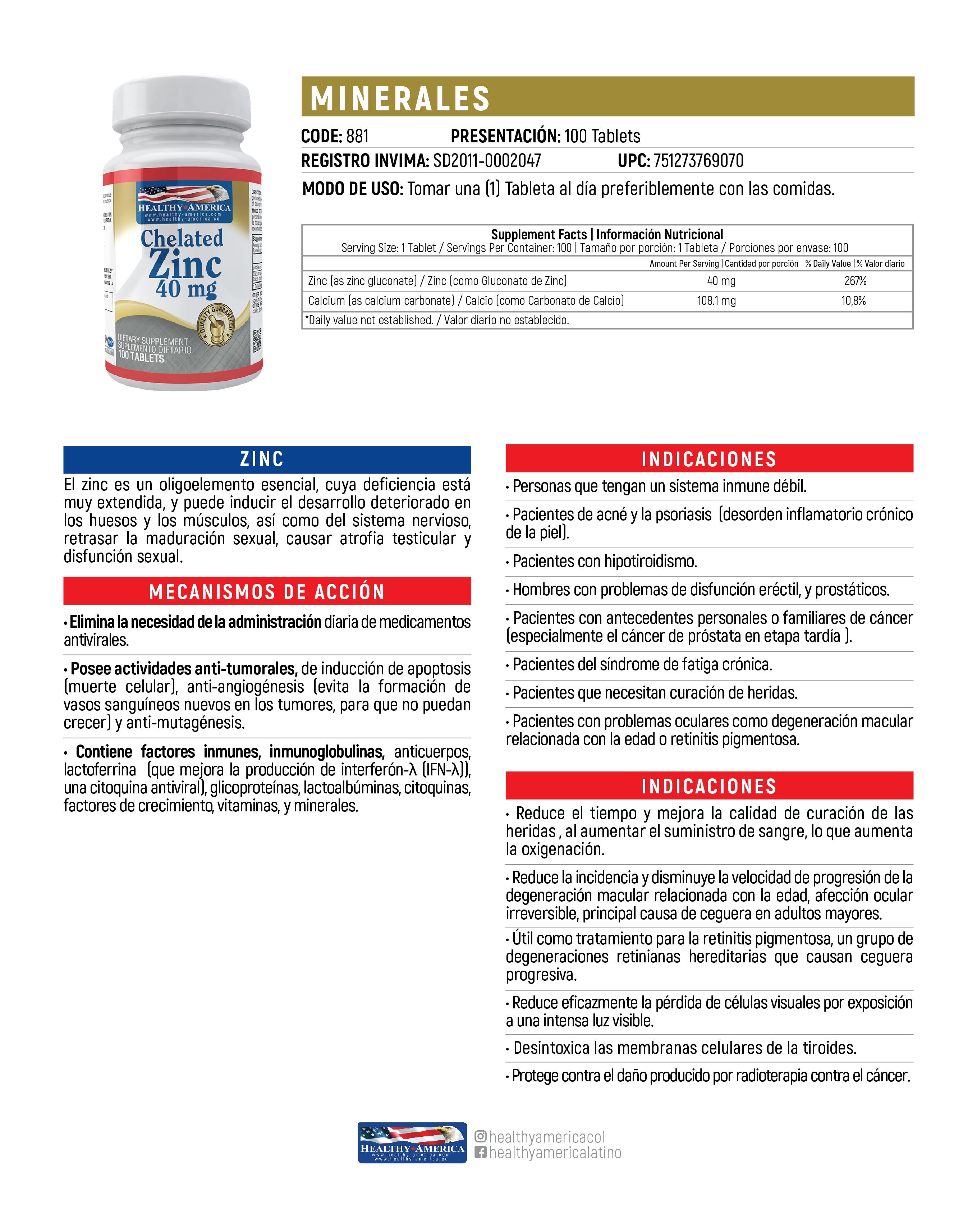 Suplemento natural que aporta zinc quelado, una forma de alta absorción que contribuye al fortalecimiento del sistema inmunológico, la salud celular y el equilibrio hormonal. También apoya la regeneración de tejidos y el bienestar de la piel.