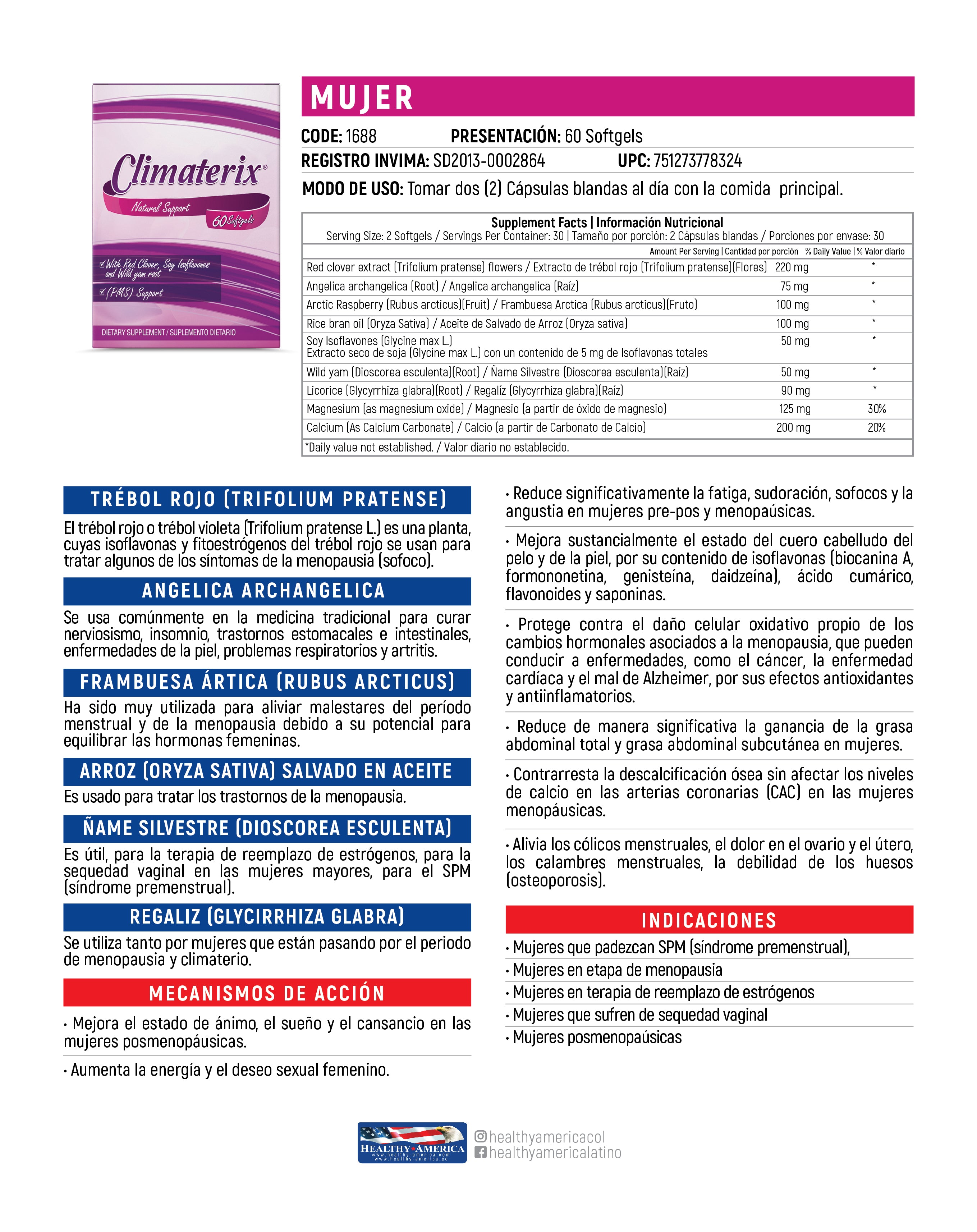 Suplemento natural especialmente formulado para mujeres en etapa de climaterio y menopausia. Ayuda a aliviar síntomas como sofocos, cambios de ánimo y sudoración, a la vez que contribuye a mantener la salud ósea, el equilibrio hormonal y el bienestar general de manera segura y efectiva.