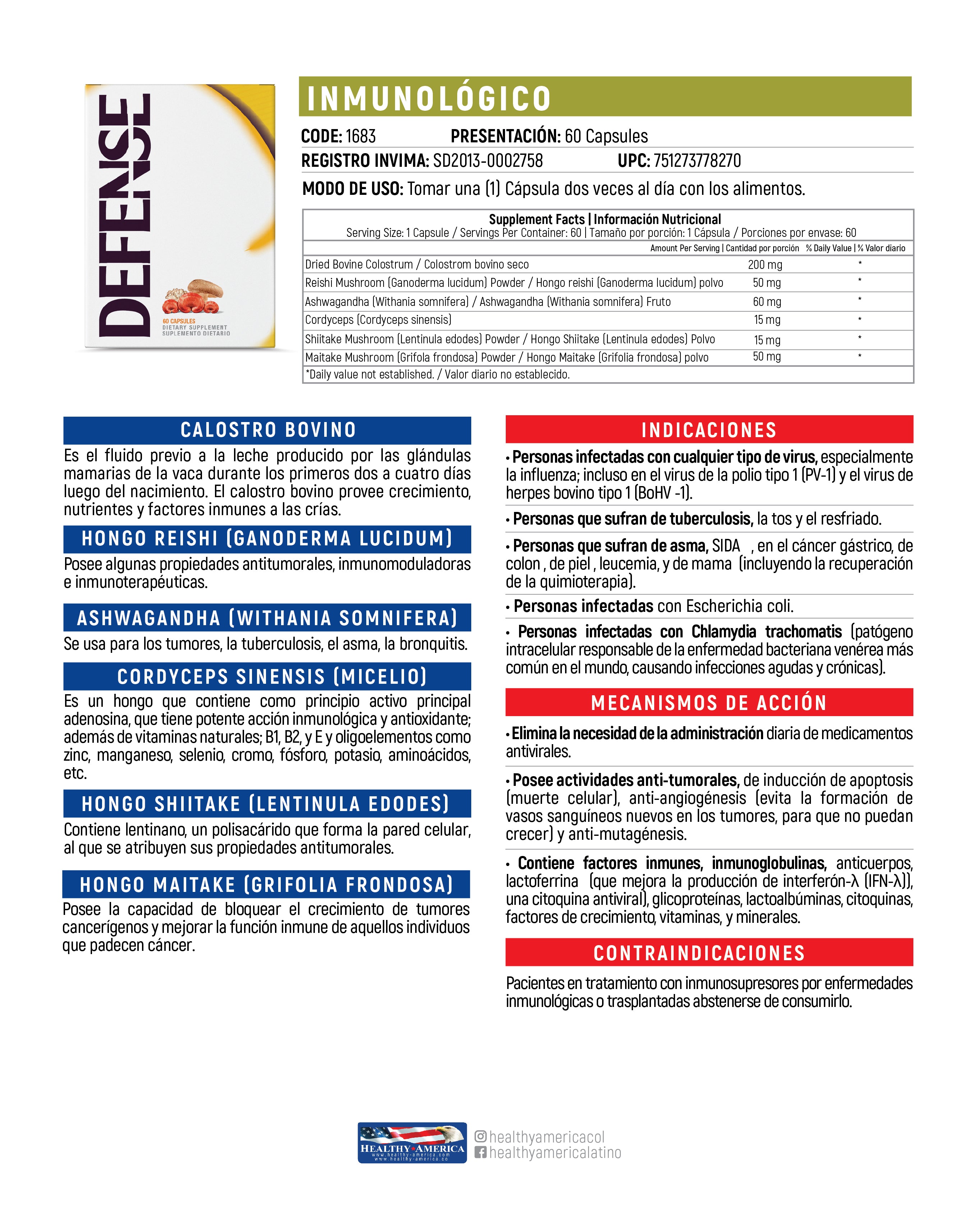 Suplemento natural formulado para fortalecer el sistema inmunológico y aumentar las defensas del organismo. Sus ingredientes ayudan a proteger frente a agentes externos, mejorar la resistencia a enfermedades y promover el bienestar general de manera efectiva y segura.