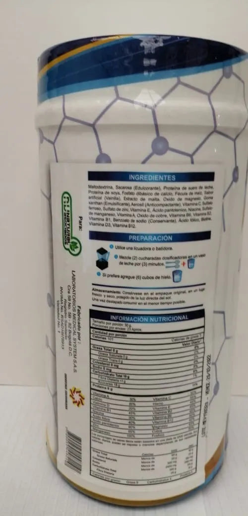 Es un suplemento nutricional con sabor a vainilla, rico en vitaminas y minerales esenciales que ayudan a fortalecer el sistema inmunológico, aportar energía y favorecer el crecimiento y desarrollo saludable. Ideal para complementar la alimentación diaria.