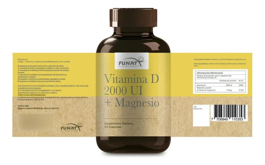 Suplemento natural que combina vitamina D y magnesio para favorecer la salud ósea y muscular. Contribuye a fortalecer huesos y dientes, apoyar la función muscular, mejorar la absorción de calcio y mantener el bienestar general del organismo de manera efectiva.