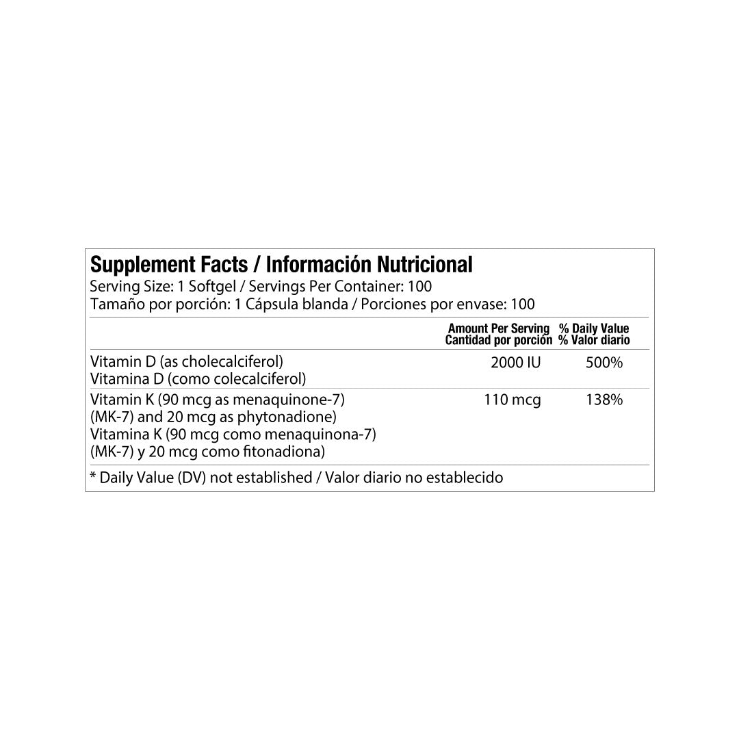 Suplemento natural diseñado para favorecer la salud ósea y cardiovascular. La combinación de vitamina D3 y K2 ayuda a mejorar la absorción de calcio, fortalecer huesos y dientes, apoyar la función muscular y promover el bienestar general de manera efectiva y segura.